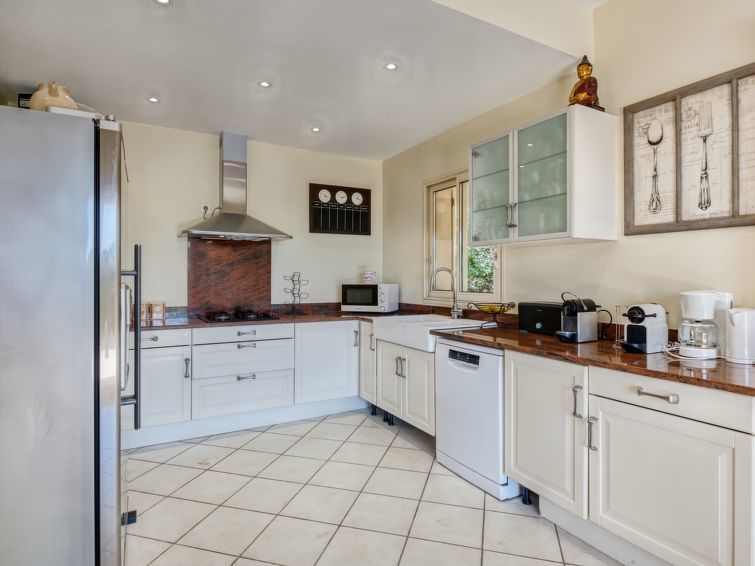 Villa 6-kamers 250 m2 op 2 verdiepingen. Mooi en gezellig ingericht: groot woon-/eetkamer met TV (Flatscreen TV). Uitgang naar het terras. 2 kamers, elke kamer heeft 1 2-pers bed (160 cm, lengte 200 cm), douche/WC. Uitgang naar het terras. 1 kamer met 2 bedden (90 cm, lengte 190 cm), douche/WC. Uitgang naar het terras. 1 kamer met 2 bedden (90 cm, lengte 190 cm), douche/WC. Groot, open keuken (4-pits kookplaat, oven, afwasmachine, magnetron, diepvriezer, elektrische koffiemachine). Bovenverdieping: 1 kamer met 1 2-pers bed (160 cm, lengte 200 cm). Uitgang naar het balkon. Badkamer, aparte WC. Air-conditioning, heteluchtverwarming. Groot terras 50 m2. Terrasmeubelen, ligstoelen (10). Uitzicht op de tuin. Ter beschikking: wasmachine, strijkijzer, kinderstoel, kinderbed tot 3 jaar, haardroger. Internet (Internet (WiFi), gratis).